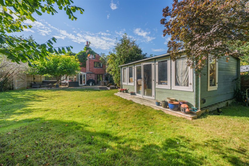 FABULOUS FOUR DOUBLE BEDROOM DETACHED HOME ON A 0.27 ACRE PLOT BACKING ONTO ORCHARDS This exceptional family home is located in a sought-after setting on the outskirts of Marden and Yalding, offering a delightful blend of rural charm and modern convenience. The area features a variety of amenities, including a former Post Office charmingly converted into a café, excellent schools, and regular high-speed train services to London. The property offers spacious and adaptable accommodation. On the ground floor, there is an inviting entrance hall leading to a generous kitchen-diner with views over the front garden. The large lounge features French doors that open onto the stunning rear garden, and a conservatory adds further living space. A handy ground-floor cloakroom completes the ground level. Upstairs, there are four spacious double bedrooms. The main bedroom offers an en-suite bathroom with both a bathtub and separate shower, while the family bathroom serves the remaining bedrooms. A noteworthy feature is the expansive loft area, accessed via a door and stairs, which benefits from a window and is currently used for excellent storage. Outside, the property offers ample parking with a driveway extending to the side and a detached garage with a pitched, peg-tiled roof. The beautifully landscaped garden features a variety of fruit trees, shrubs, and borders, all backing onto working orchards that provide stunning views. A well-appointed summer house with power and water currently serves as a studio, offering flexible use as a home office, salon, or children’s play area.